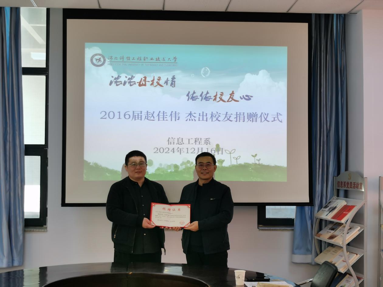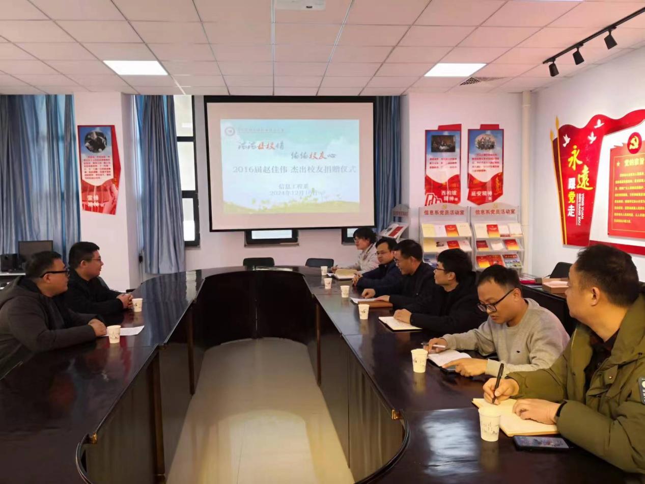 2024年12月16日,赵佳伟校友支持信息工程系建设捐赠仪式在系二楼党员活动室举行,系党总支书记徐建平、系主任冯磊、系副主任张小志及教师代表参加捐赠仪式。校友赵佳伟秉承回馈社会与感恩母校的初心,向母校捐赠了一套先进的VR设备,用于教学与科研,助力信息工程系在数字化教学领域的进一步发展。