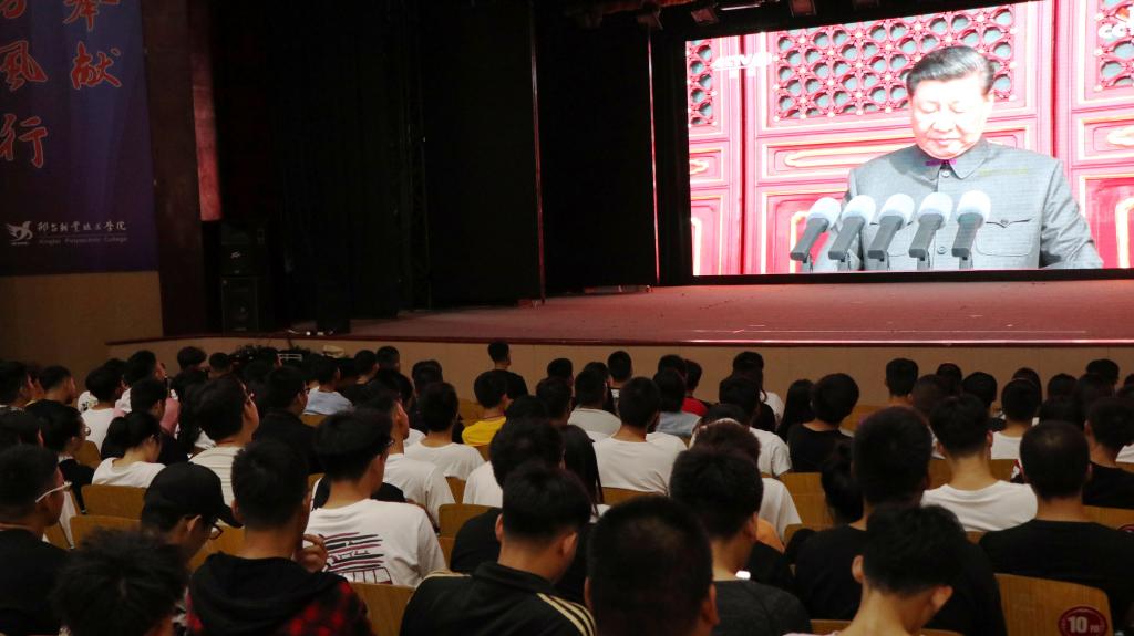 上午9时许,收看直播的师生陆续到达红星礼堂,怀着激动的心情等待着大会的开始。上午10时,大会正式开始,习近平总书记的讲话深深打动在场每一位师生;当观看威武雄壮的阅兵仪式时,身为中国人的自豪感油然而生,更加坚定了理想信念。