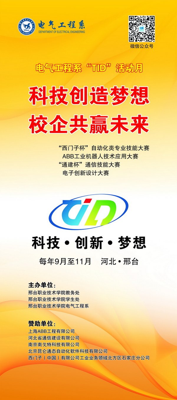 邢台职业技术学院电气工程系为了贯彻beat365“强化内涵,创新驱动”的发展战略,加强专业内涵建设,培养学生的职业意识、创新精神、团队合作精神,激发学生对专业的热爱,于2016年创办了“TID(Technology Innovation Dream)活动月”,确定为每年的11月份。