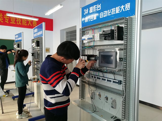 从17日上午八时开始,历时7个小时的比拼,参赛选手经过“现场配盘接线、现场编程及功能实现”两个环节进行对决,评委组依据“接线工艺、编程功能调试”两个方面指标进行测评,经过激烈角逐,电气本162班崔玉龙、宋瑞滢凭借扎实的配盘接线技能及编程技能荣获赛项一等奖;电气165班段立男、刘超民,电气163班代珅、邹仁杰荣获赛项二等奖;电气162班王英帅、王纪虎,电气172班姚振华、电气171班任岩,电气161班彭飞、郑洁义获得赛项三等奖。
