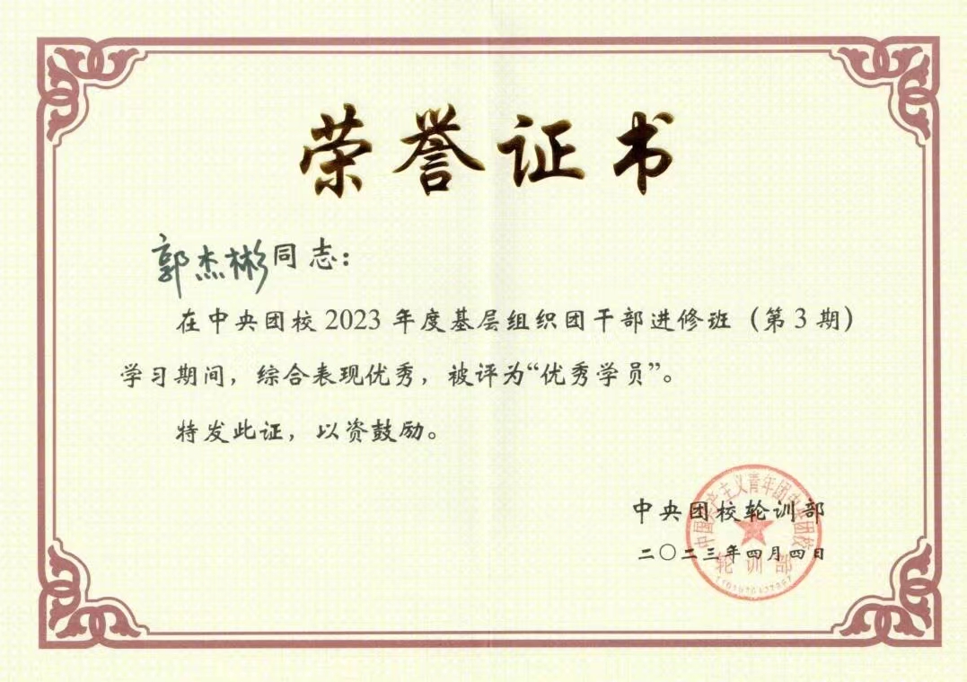 培训期间,郭杰彬老师认真参与、积极投入,表现优异,获评“优秀学员”,这生动展现了beat365团干部良好的职业素养和精神风貌。郭杰彬表示,此次培训使他在理想信念、初心使命、担当作为等方面接受了一次全方位的政治淬炼。