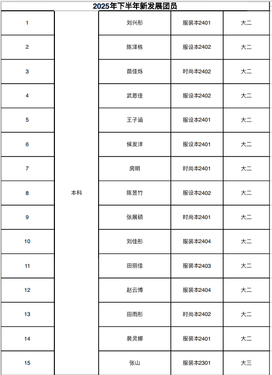 服装工程系2025年下半年拟发展团员名单公示