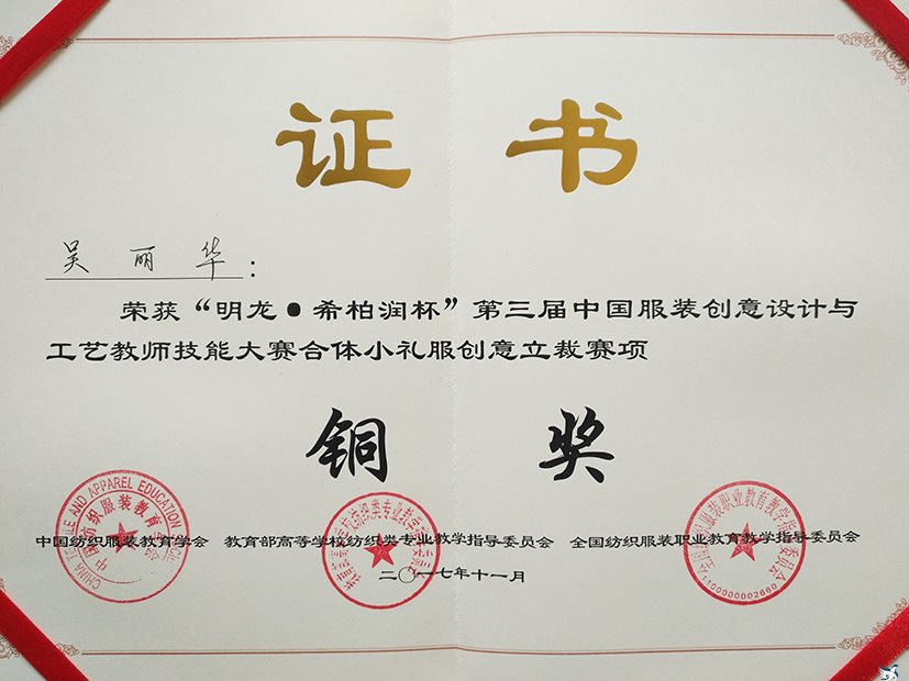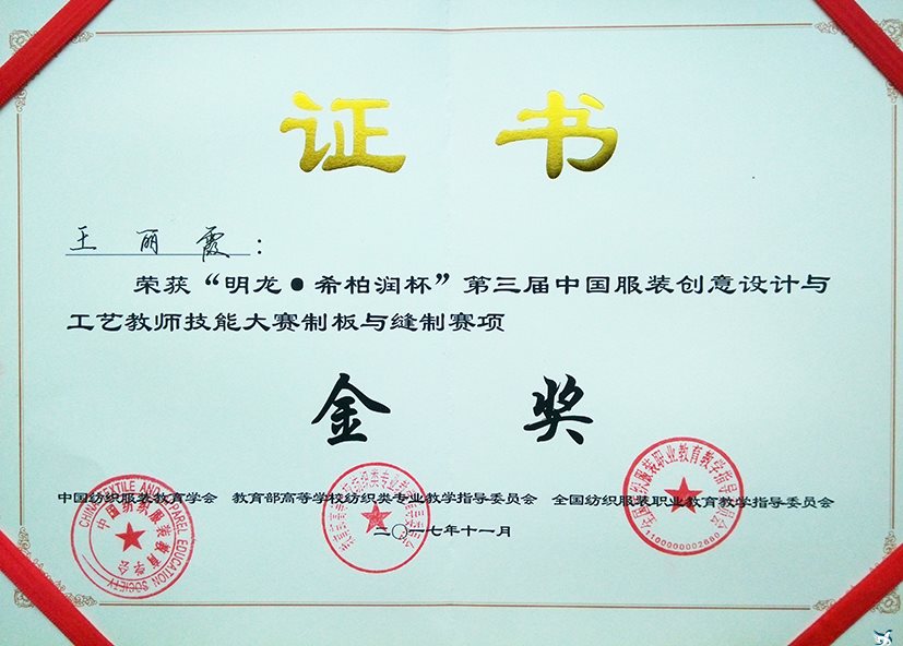 11月28至29日,由中国纺织教育学会、教育部高等学校纺织类专业教学指导委员会、全国纺织服装职业教育教学指导委员会联合举办的第三届中国服装创意设计与工艺教师技能大赛在重庆工商学校隆重举行,共有来自全国24个省市的108所本专科院校250多位教师同台竞技。经过激烈角逐,我院王丽霞老师在制板与缝制赛项获得金奖,吴丽华老师在合体小礼服创意立裁设计赛项获得铜奖。