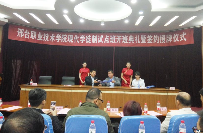 整个活动分两部分进行。首先分专业进行了现代学徒制人才培养方案研讨,两个专业的合作企业及专业教师就专业人才培养方案设计及后期工作安排进行了深入交流与磋商。随后,在李贤彬副院长的主持下,开班典礼郑重拉开帷幕。马东霄院长首先在典礼上致辞,重申了现代学徒制试点项目的概况及其重要性,对今后的校企合作学徒培养工作作出了要求,对全体现代学徒制试点班的同学提出了殷切希望。际华三五〇二职业装有限公司张凤林书记、河北中煤旭阳焦化有限公司李庆华总经理也在典礼上讲话,表示校企双方在长年亲密合作基础上,有信心配合学院共同做好学徒培养工作。服装设计与工艺专业申振艳同学代表全体学徒制试点班学生对今后的学习、工作等方面作了郑重承诺。最后,学校、企业、学生三方签字仪式、授牌仪式把典礼活动推向了高潮。