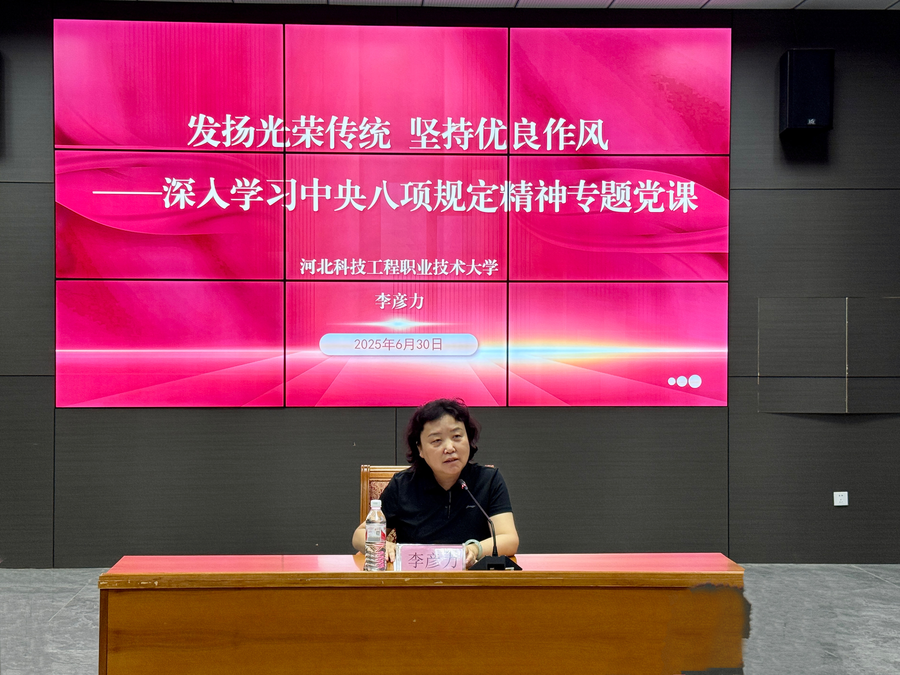 为持续巩固落实中央八项规定精神成果,进一步强化教职工政治意识和纪律规矩,6月30日,校党委副书记李彦力以“发扬光荣传统,坚持优良作风”为题,为服装工程系党总支、建筑工程系党总支党员教师讲授中央八项规定精神学习教育专题党课。
