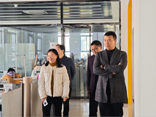 两家公司负责人先后参观了我系实训中心和工作室,对我系育人环境进行细致了解。服装工程系党总支书记王振贵、服装工程系主任辛东升、学生管理科科长郑印乐全程陪同参观并介绍了我系育人体系和2025届毕业生的基本情况。