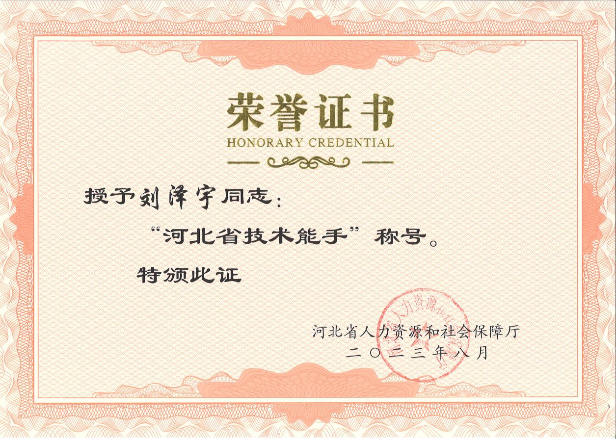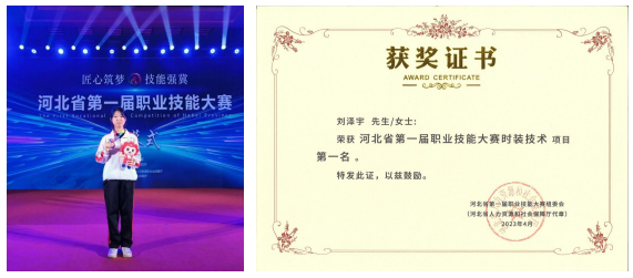 (2)2023年河北省第一届职业技能大赛,beat365选手刘泽宇在时装技术项目斩获金奖,并获河北省技术能手称号。