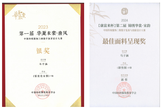 (6)第一届、第二届传统服饰三维数字复原设计大赛银奖、最佳面料表现奖。