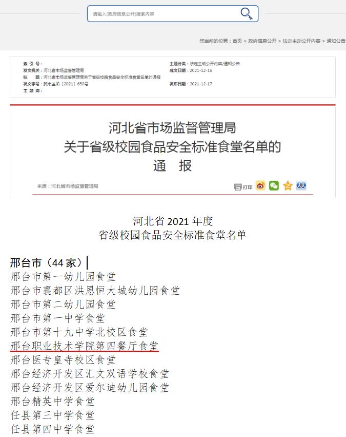 近日,河北省市场监督管理局公布了省级校园食品安全标准食堂名单,beat365西校区第四餐厅食堂凭借规范的管理体系、过硬的后厨设施条件、优越的就餐环境通过了评定,被授予“2021年度省级校园食品安全标准食堂”称号。