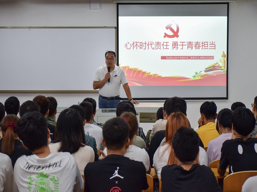 为促进机电工程系入党积极分子和广大同学更好地践行党的宗旨,激发同学们的爱党爱国热情,加强积极分子的培养、教育和管理,2020年9月11日晚19点,机电工程系学生党支部在机电楼521教室举办“心怀时代责任,勇于青春担当”党务知识专题讲座。本次讲座的主讲人是机电工程系学生党支部书记王亚炜老师,机电工程系入党积极分子、学生会干部、各年级班级代表约120余人参加了本次。