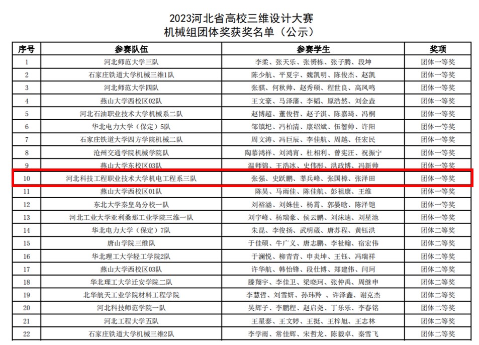 为推动图学教育事业的发展,着力培养大学生的动手能力、自主创新能力及大国工匠精神,更好地服务于大学生创新创业,5月27日,河北省教育厅和河北省图学会共同举办2023年河北省高校制图与构型能力大赛和三维设计大赛。机电工程系派出4队同学参加比赛,获得团体一等奖3项,个人特等奖2项,一等奖5项,二等奖10项,三等奖1项的好成绩。