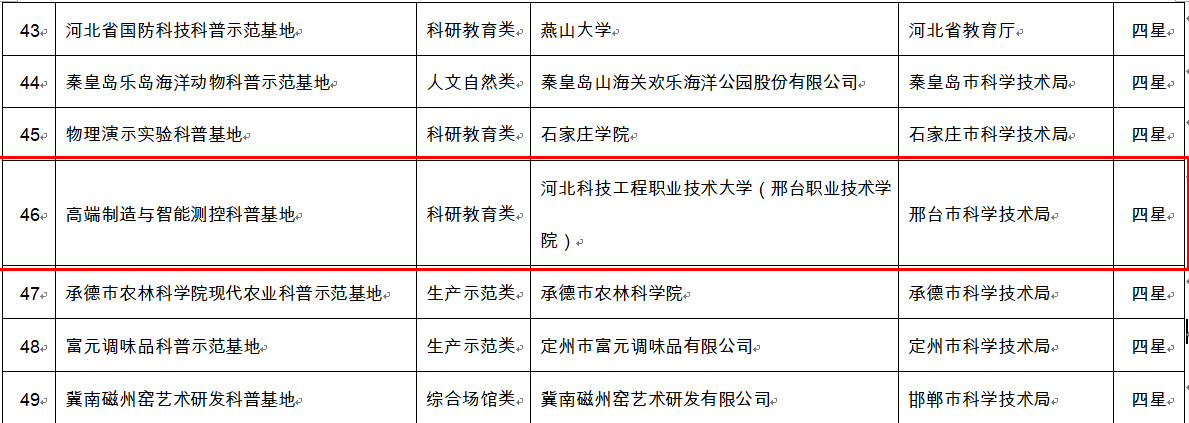 近日,河北省科技厅公布了河北省第三批科普示范基地的认定名单,beat365英国官方网站“河北省高端制造与智能测控科普基地”(科研教育类,四星)成功获批河北省科普示范基地。