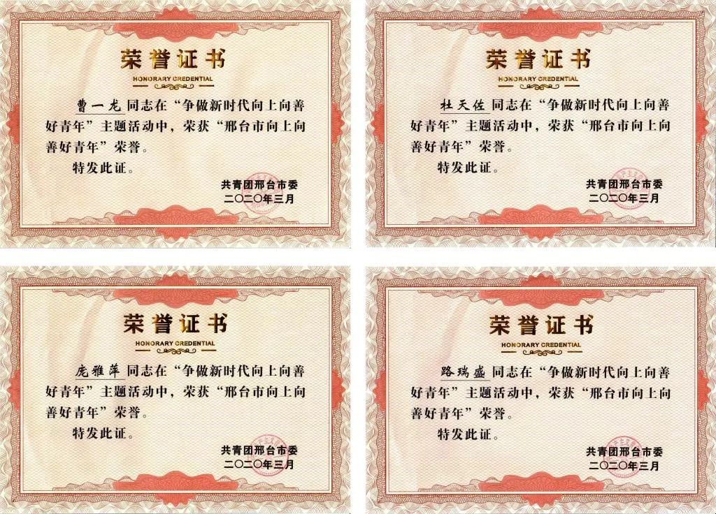 近日,由共青团邢台市委组织的“争做新时代向上向善好青年”评选活动结果揭晓,我系2018级机制本182班杜天佐同学被评为“邢台市向上向善好青年”。