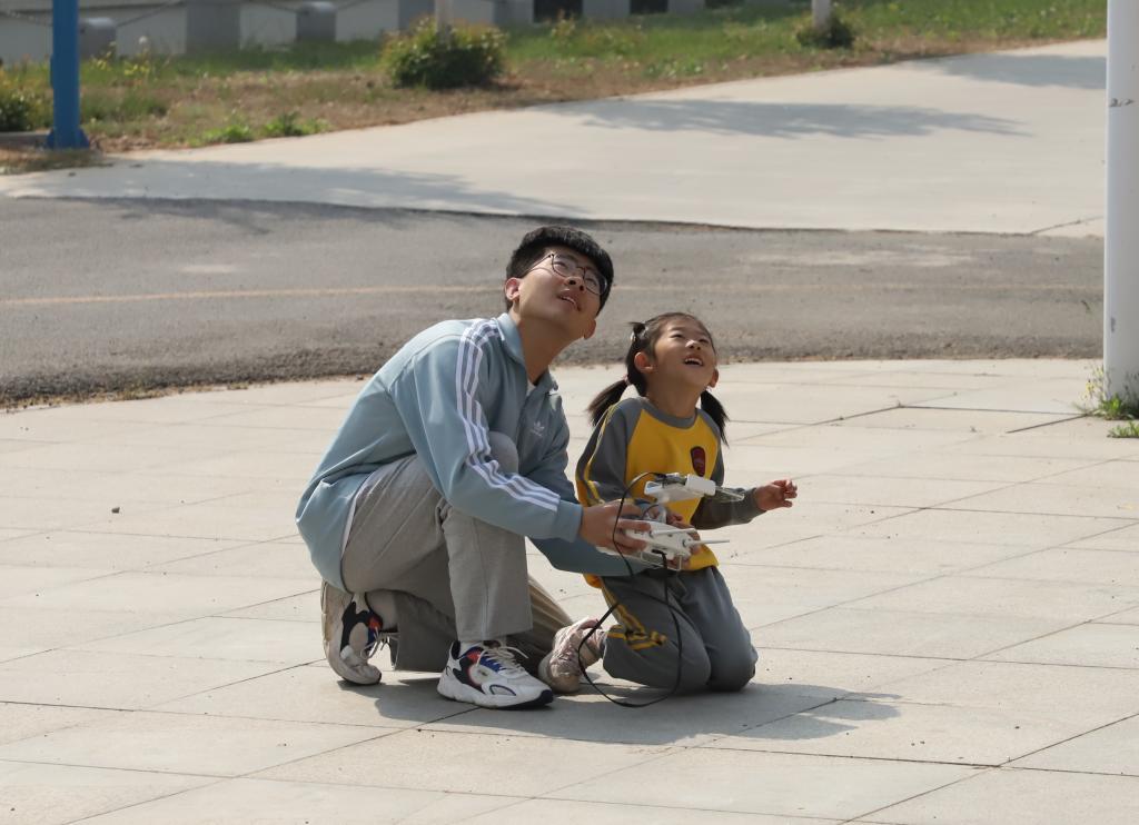 在无人机应用技术中心老师用通俗易懂的语言向孩子们介绍了无人机的分类、结构与系统、飞行原理以及无人机的发展历史、现状与未来趋势,随后在室外进行了飞行演示。