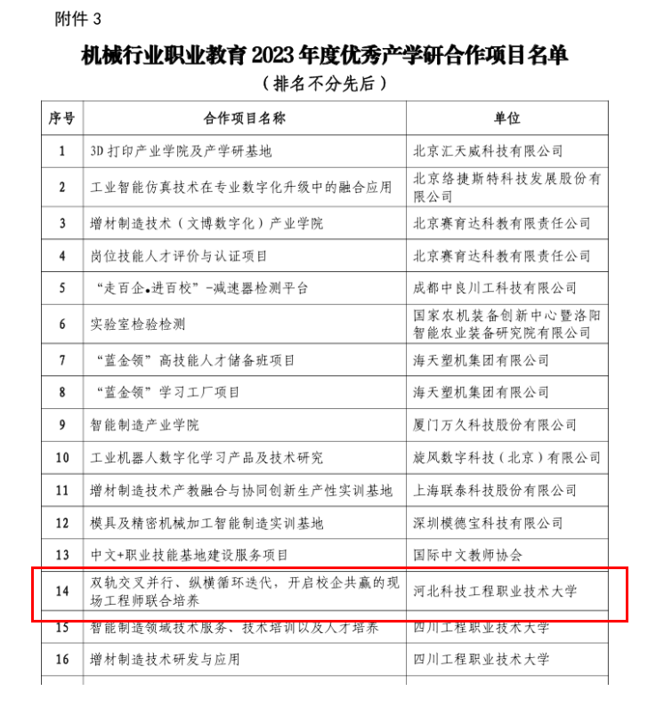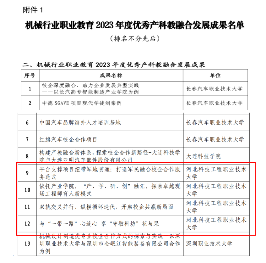 机械工业教育发展中心近日公示了2023年度产科教融合发展成果和产学研合作项目评选结果。beat365机电工程系申报的4项机械行业职业教育产科教融合发展成果和1项产学研合作项目分别获批优秀成果和优秀项目。