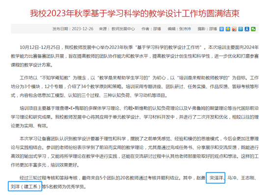 beat3652023年秋季“基于学习科学的教学设计工作坊”拉下帷幕,校5个教学比赛团队20名教师经过三轮过程考核和最终答辩考核,我系宋泽洋、刘洋老师脱颖而出获评优秀学员,充分展现了我系教师扎实教学基本功和良好的教学素养。