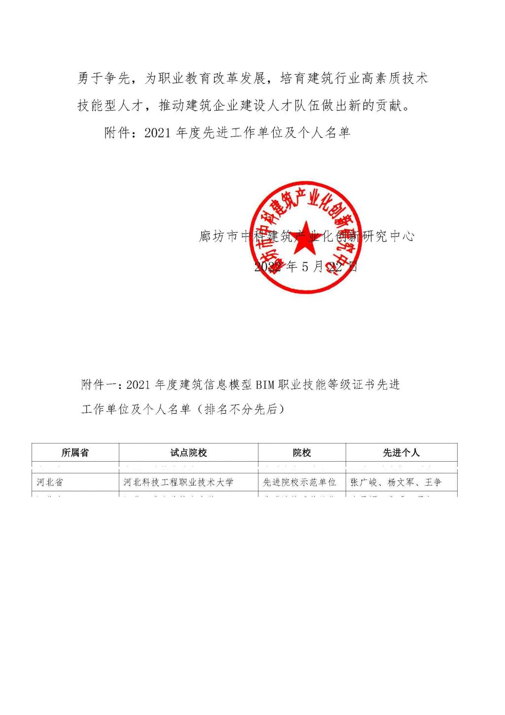 2022年5月22日,廊坊市中科建筑产业化创新研究中心公布了2021年度1+X建筑信息模型(BIM)职业技能等级证书先进工作单位名单,beat365被授予“先进院校示范单位”。同时,建筑工程系张广峻、杨文军、王争三名教师被授予“年度先进个人”荣誉称号。