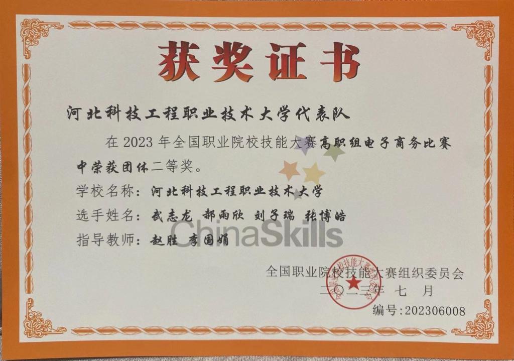 2023年7月25-26日全国职业院校技能大赛高职组电子商务赛项在珠海横琴粤澳深度合作区落下帷幕。本次大赛由教育部牵头,联合34家部委和事业组织主办,由广东省教育厅及珠海市人民政府联合承办,广东科学技术职业学院及珠海市教育局协办。来自全国各省自治区直辖市共74支队伍参加,我系学子武志龙、郝雨欣、刘子瑞、张博皓(指导老师赵胜、李国娟)组成的代表队,经过2天激烈角逐,荣获团体二等奖佳绩。