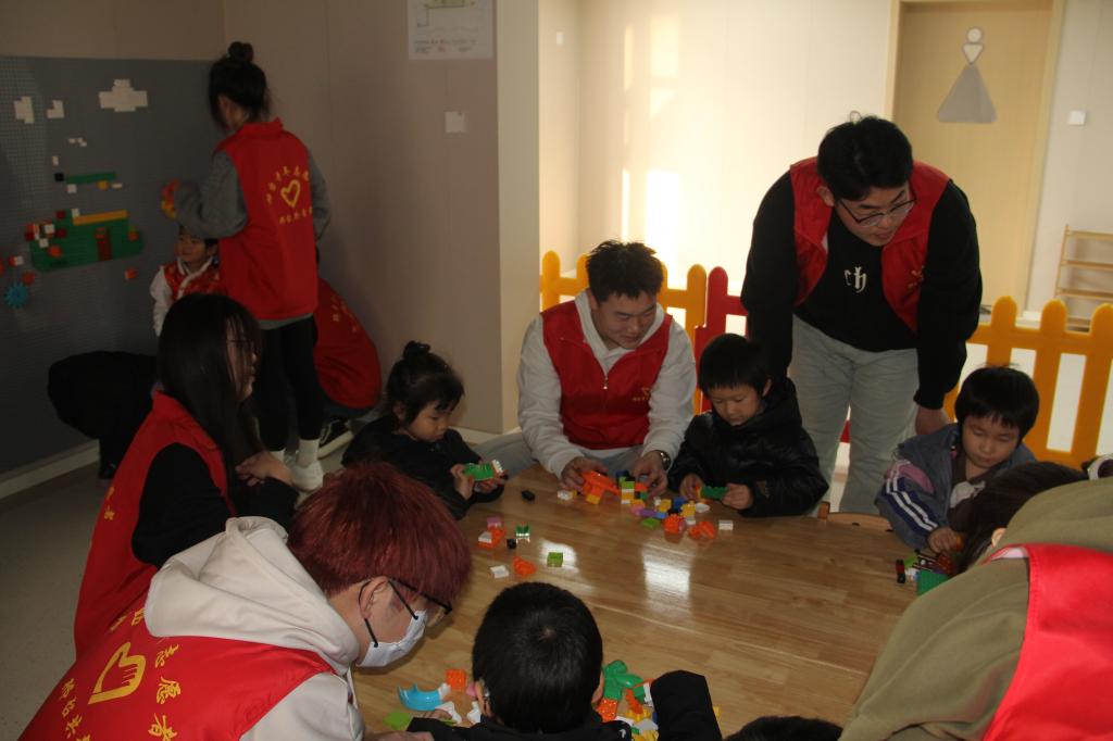 活动以开发想象力为主题,志愿者先发放积木玩具并引导孩子们发挥想象力进行自由创造,鼓励小朋友们进行多方面的探索。其次,通过积木拼搭,志愿者更加了解孩子们的内心世界,彼此的距离进一步拉近。看着孩子们沉浸在拼积木时的投入模样,现场的每一位志愿者和老师都露出了欣慰的笑容。