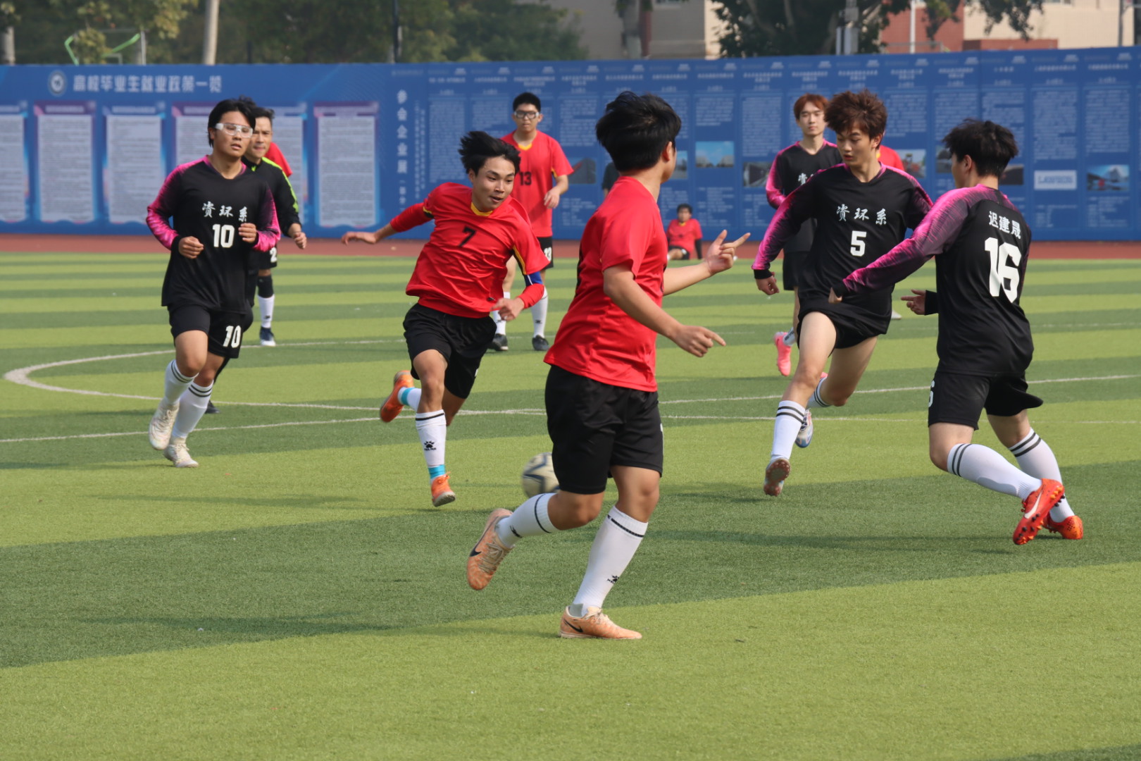 在小组赛中,队员们巧妙运用战术成功突围,淘汰赛阶段凭借顽强毅力和精湛球技挺进季军争夺赛。11月12日,在争夺赛中,经管系健儿在比分落后情况下,大家同心协力,面对对方进攻沉着冷静,毫不气馁,积极进攻,通过精妙配合扳平比分,最终通过点球大战,以5:1战胜对手,取得季军。