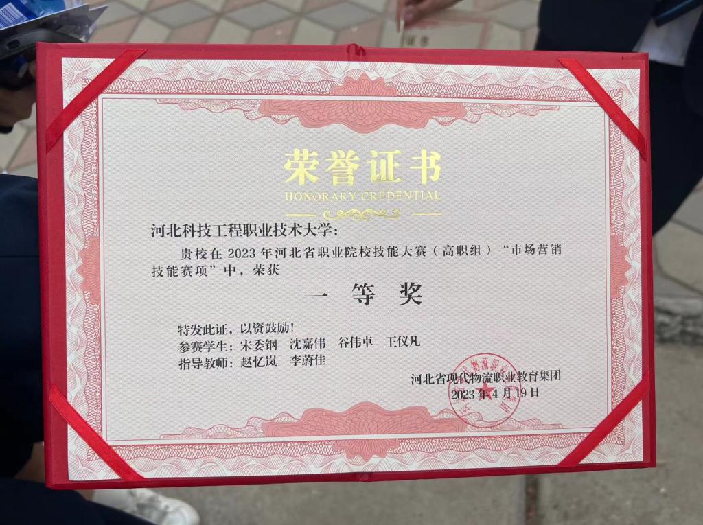 4月19日,2023年河北省职业院校技能大赛(高职组) "市场营销技能”赛项落下帷幕,beat365经济管理系学生宋委钢、沈嘉伟、谷伟卓、王仪凡在赵忆岚、李蔚佳老师的指导下刻苦训练、精心准备、沉着应战,经过为期两天、三个赛项的激烈角逐,从全省29所高职院校、116名选手中脱颖而出,取得了大赛的主要两项赛项——数字营销赛项总体第一名、情境营销赛项小组第一名的优异成绩,并最终以三个赛项总分排名第二的成绩荣获大赛一等奖!
