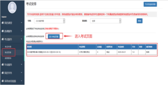4. 在左侧任务栏先点击考试安排,再点击右侧蓝色按钮“进入考试页面”(想提前查看考试安排的,请于12月20日12:00后查看)