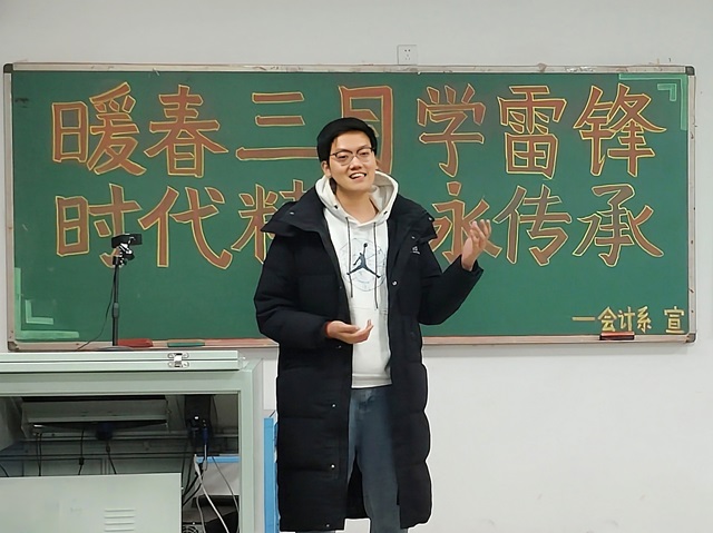 活动伊始,王凯迪老师向同学们讲述了雷锋同志的出身,让同学们对雷锋的形象有了一个新的认知,他通过对雷锋经历的阐述,改变了同学们对于雷锋形象的模糊认识,让同学们认识到了一个有血有肉的真实雷锋形象。接着,王凯迪老师向同学们展示了雷锋同志的先进事迹,将雷锋持之以恒的信仰结合个人对当今时代的社会见闻,让为大家展示了雷锋精神在当代的立体存在与价值。最后,王凯迪老师指出同学们应在实践中把雷锋精神的学习成效落实到行动上,不断续写传承雷锋精神的熠熠生辉的画卷,不要见将“学雷锋”当做刻板的口号,要认识到雷锋精神背后投射的普通人的善良与勇敢,让雷锋精神在新时代绽放更加璀璨的光芒。