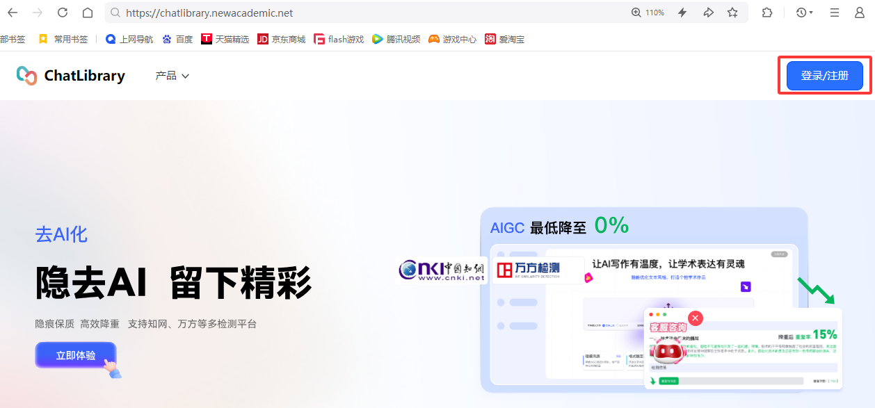 (1)打开ChatLibrary AI智能服务平台,点击右上角的“登录/注册”按钮,弹出登录框。