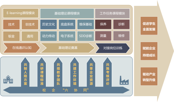 汽车服务工程技术专业秉持创新发展理念,明确树立了“促进学生全面发展、赋能企业成长、驱动产业升级”的核心目标,并坚守“共建共享、共创共赢”的校企合作精神。在此指导下,校企深度产教融合,巧妙融合系统论、行动论及产教融合理论,深入探索并改革人才培养模式。系统性地构建了校企“六协同”育人新机制,促进了学生能力的全面提升,也为企业发展注入了新的活力,更为产业升级提供了有力的人才支撑。