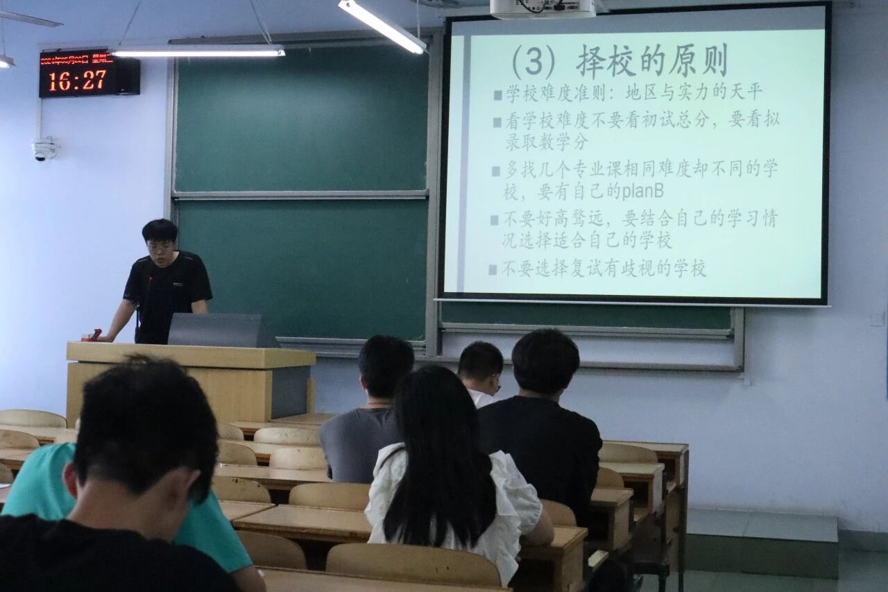 本次交流会分为四个主题,主要为考研择校经验、时间安排、数学与英语学习、政治与专业课学习。主讲学生代表根据自身考研经历,层层分析,深入浅出,他们首先从考研目的、考研现状和择校原则进行细致的讲解。
