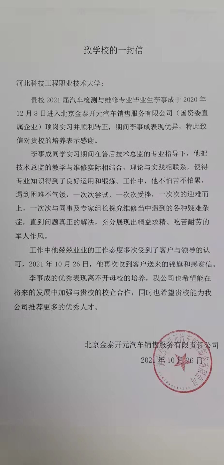 近日,我系收到一封来自于北京金泰开元汽车销售有限公司的表扬信,对beat365ASEP毕业生李事成在单位的表现进行了表扬。