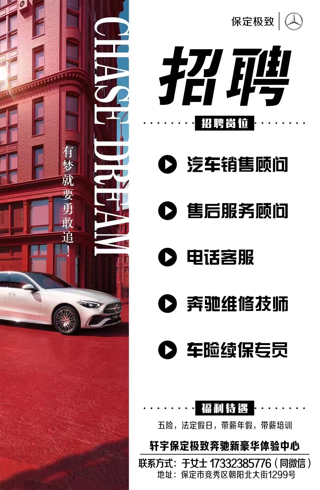 轩宇保定极致奔驰新豪华体验中心招聘汽车销售顾问,售后服务顾问等