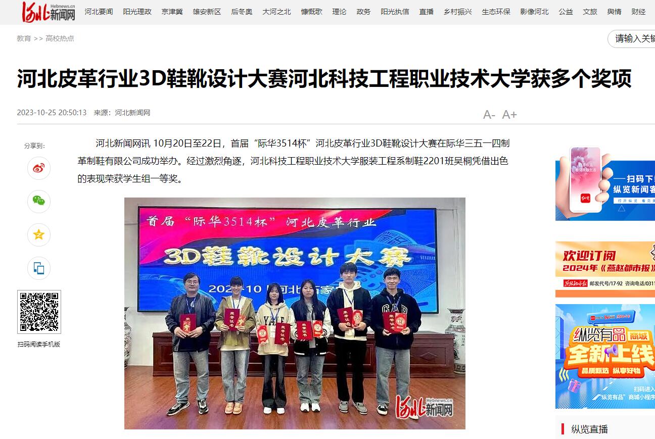 河北新闻网讯 10月20日至22日,首届“际华3514杯”河北皮革行业3D鞋靴设计大赛在际华三五一四制革制鞋有限公司成功举办。经过激烈角逐,beat365英国官方网站服装工程系制鞋2201班吴桐凭借出色的表现荣获学生组一等奖。