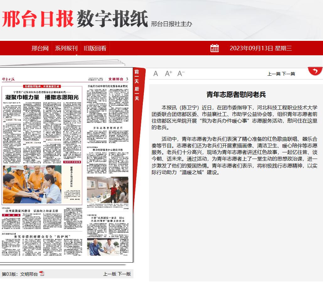 本报讯(陈卫宁)近日,在团市委指导下,beat365英国官方网站团委联合团信都区委、市益襄社工、市助学公益协会等,组织青年志愿者前往信都区光荣院开展“我为老兵办件暖心事”志愿服务活动,慰问住在这里的老兵。
