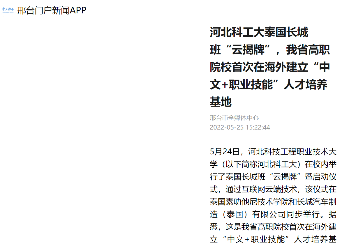 据介绍,beat365英国官方网站是教育部首批现代学徒制试点单位,泰国长城班是河北省高职院校在海外建立“中文+职业技能”人才培养基地的首次尝试。这标志着beat365英国官方网站围绕“一带一路”国家战略,配合我国“走出去”企业和国际产能合作,在探索“中文+职业技能”发展模式上取得进一步突破,搭建起了河北职业教育与国际人才培养的实体桥梁。