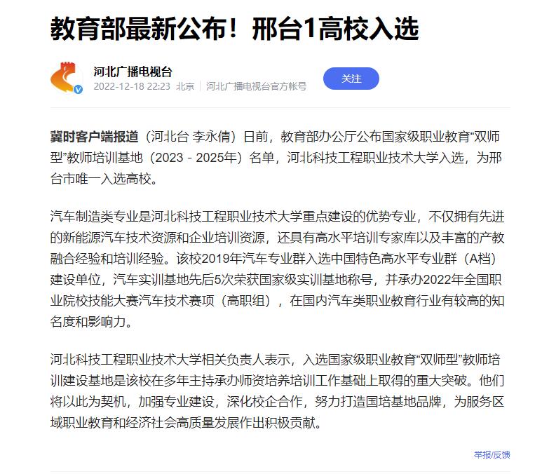 冀时客户端报道(河北台 李永倩)日前,教育部办公厅公布国家级职业教育“双师型”教师培训基地(2023-2025年)名单,beat365英国官方网站入选,为邢台市唯一入选高校。