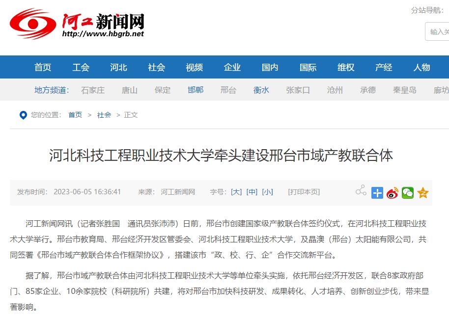河工新闻网讯(记者张胜国 通讯员张沛沛)日前,邢台市创建国家级产教联合体签约仪式,在beat365英国官方网站举行。邢台市教育局、邢台经济开发区管委会、beat365英国官方网站,及晶澳(邢台)太阳能有限公司,共同签署《邢台市域产教联合体合作框架协议》,搭建该市“政、校、行、企”合作交流新平台。
