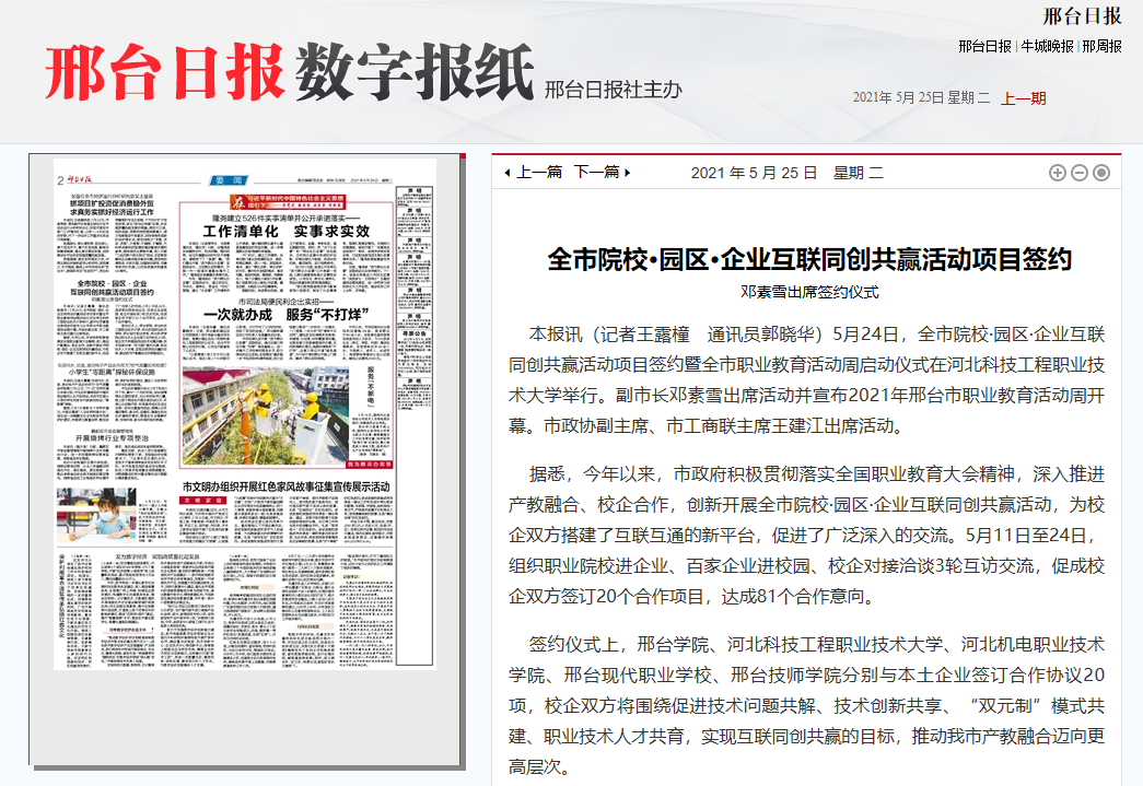 本报讯(记者王露橦 通讯员郭晓华)5月24日,全市院校·园区·企业互联同创共赢活动项目签约暨全市职业教育活动周启动仪式在beat365英国官方网站举行。副市长邓素雪出席活动并宣布2021年邢台市职业教育活动周开幕。市政协副主席、市工商联主席王建江出席活动。