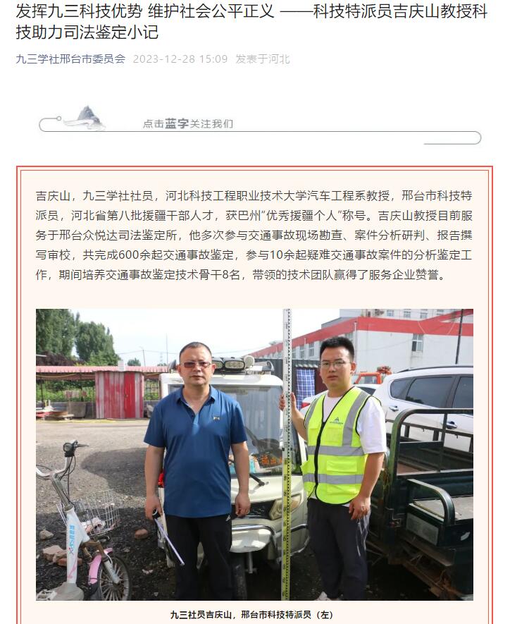 双岗建功、实干争先,像吉庆山一样深耕专业领域、服务司法鉴定工作、维护社会公平正义的社员在九三比比皆是。近年来,九三学社邢台市委带领全体社员,解放思想,奋发进取,围绕我市经济社会高质量发展,充分挖掘社内专家资源,不断优化服务内容,发挥九三学社的科技特色和科普特长,以科技赋能、入企帮扶、引智创新等多种形式提供精准化社会服务,为助力“太行泉城,美丽邢台”城市建设贡献智慧力量,以实际行动践行九三的责任与担当。