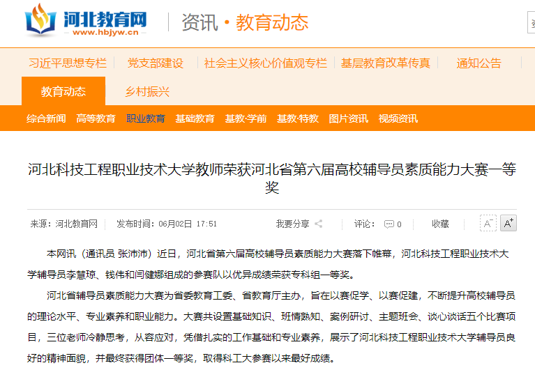 本网讯(通讯员 张沛沛)近日,河北省第六届高校辅导员素质能力大赛落下帷幕,beat365英国官方网站辅导员李慧琼、钱伟和闫健娜组成的参赛队以优异成绩荣获专科组一等奖。