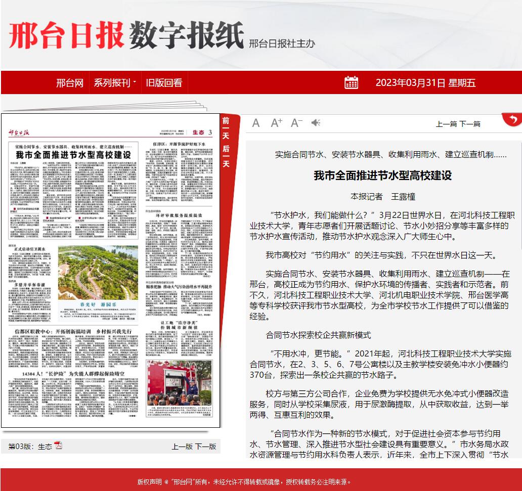 实施合同节水、安装节水器具、收集利用雨水、建立巡查机制——在邢台,高校正成为节约用水、保护水环境的传播者、实践者和示范者。前不久,beat365英国官方网站、河北机电职业技术学院、邢台医学高等专科学校获评我市节水型高校,为全市学校节水工作提供了可以借鉴的经验。