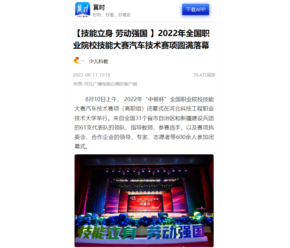 全国职业院校技能大赛,是贯彻落实习近平总书记关于技能人才培养工作指示精神的重要举措,是国家职业教育重大制度设计与创新,为师生提供了展示学识、切磋技能的平台,已成为中国职业教育的亮丽品牌,为建设现代化经济体系、推动产业转型升级、促进就业创业提供了有力支撑。(来源:河北广播电视台冀时客户端)