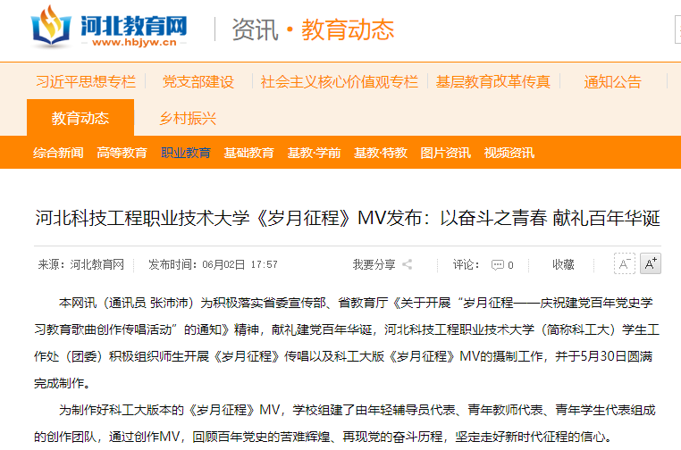 本网讯(通讯员 张沛沛)为积极落实省委宣传部、省教育厅《关于开展“岁月征程——庆祝建党百年党史学习教育歌曲创作传唱活动”的通知》精神,献礼建党百年华诞,beat365英国官方网站(简称beat365)学生工作处(团委)积极组织师生开展《岁月征程》传唱以及beat365版《岁月征程》MV的摄制工作,并于5月30日圆满完成制作。