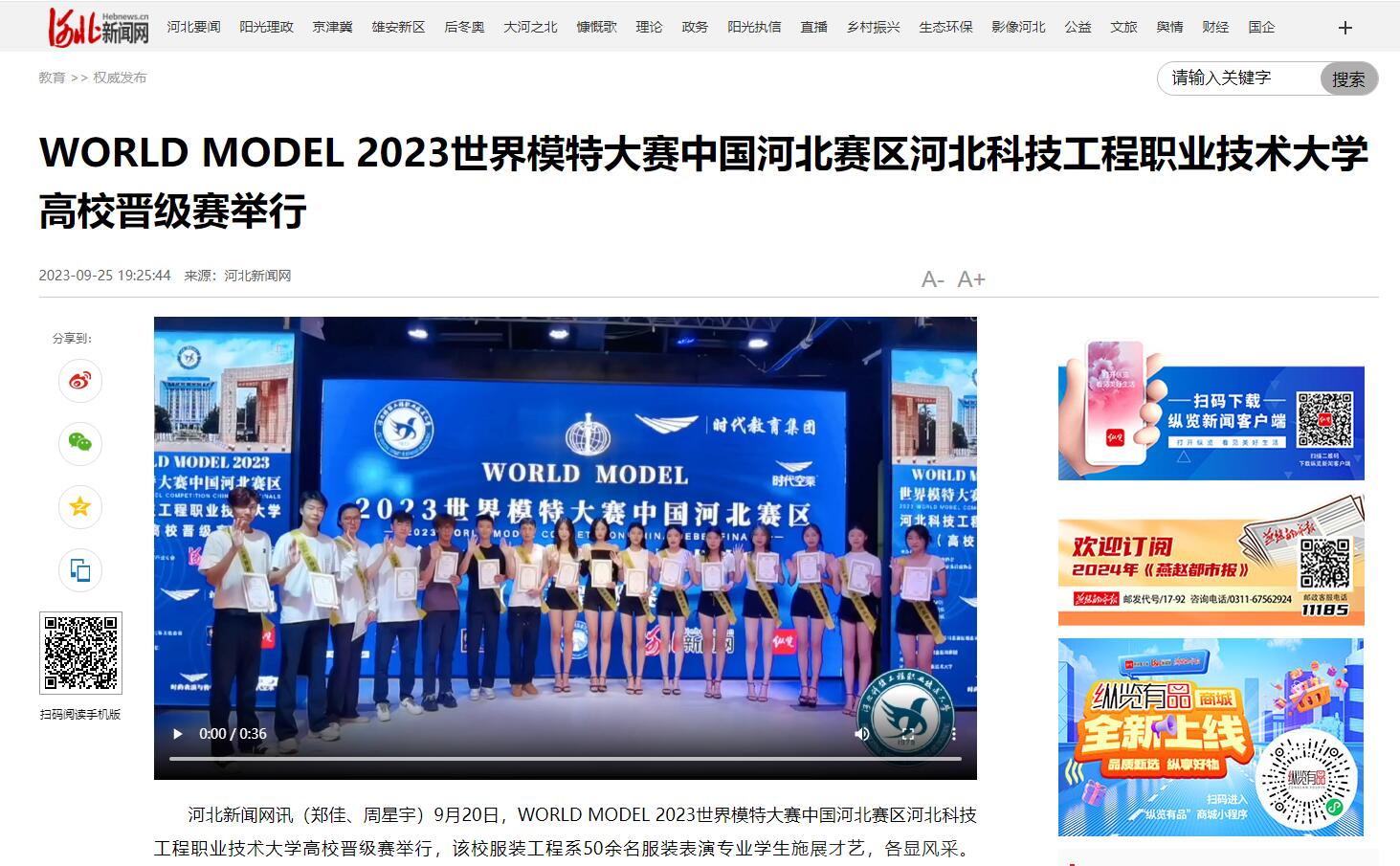 本次比赛由河北省纺织与服装行业协会、河北省服装设计与模特表演行业协会主办,时代教育集团承办,河北科技大学、beat365英国官方网站、邯郸学院、河北艺术职业学院、河北传媒学院、燕京理工大学协办。比赛分为晋级赛、总决赛两个阶段,最终确定100名优秀选手进入河北总决赛,进入总决赛的选手还可以免费参加由时代教育集团提供的形体培训、表达培训、模特文化培训等,深入了解模特行业。