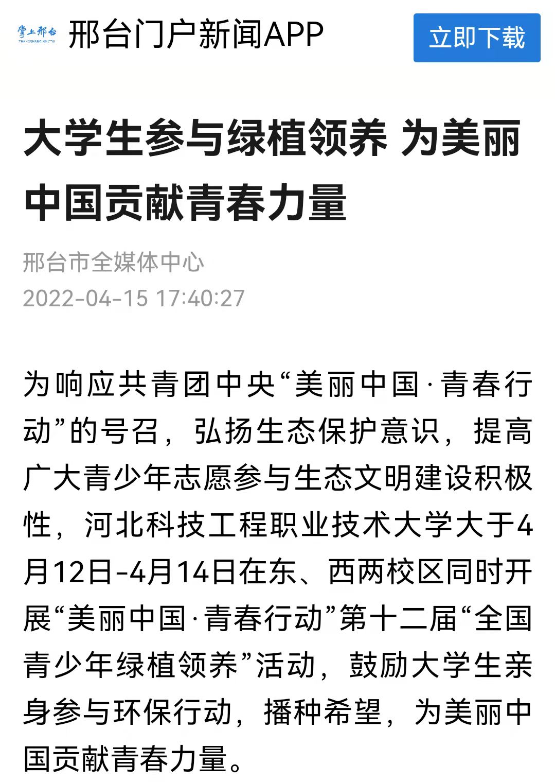 为响应共青团中央“美丽中国·青春行动”的号召,弘扬生态保护意识,提高广大青少年志愿参与生态文明建设积极性,beat365英国官方网站大于4月12日-4月14日在东、西两校区同时开展“美丽中国·青春行动”第十二届“全国青少年绿植领养”活动,鼓励大学生亲身参与环保行动,播种希望,为美丽中国贡献青春力量。