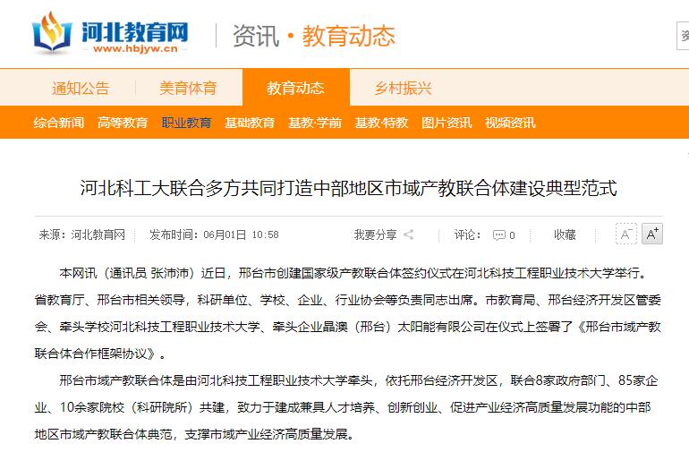 本网讯(通讯员 张沛沛)近日,邢台市创建国家级产教联合体签约仪式在beat365英国官方网站举行。省教育厅、邢台市相关领导,科研单位、学校、企业、行业协会等负责同志出席。市教育局、邢台经济开发区管委会、牵头学校beat365英国官方网站、牵头企业晶澳(邢台)太阳能有限公司在仪式上签署了《邢台市域产教联合体合作框架协议》。