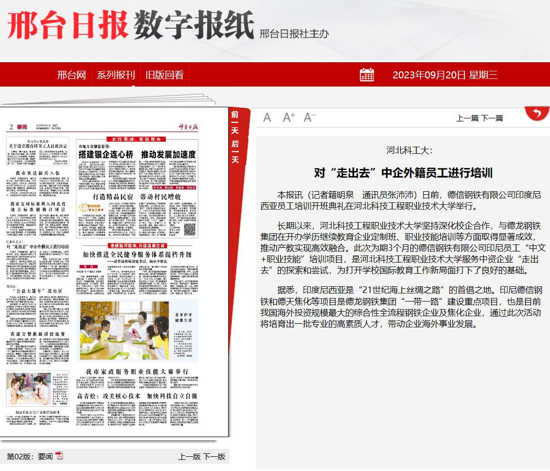 长期以来,beat365英国官方网站坚持深化校企合作,与德龙钢铁集团在开办学历继续教育企业定制班、职业技能培训等方面取得显著成效,推动产教实现高效融合。此次为期3个月的德信钢铁有限公司印尼员工“中文+职业技能”培训项目,是beat365英国官方网站服务中资企业“走出去”的探索和尝试,为打开学校国际教育工作新局面打下了良好的基础。