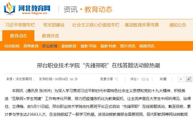 本网讯(通讯员 张沛沛)为深入学习贯彻习近平新时代中国特色社会主义思想和党的十九大精神,积极推进“互联网+学生党建”工作有序化开展,努力把疫情危机化为教育契机,让主流声音在大学生中间听得见、站得住、立得稳,自5月11日起,邢台职业技术学院依托易班平台正式启动“先锋邢职”在线答题活动,截至目前,累计参与学生达23663人次,在全院掀起了一股学习热潮。该活动被教育部全国易班网、现代职教网等网站转载报道。