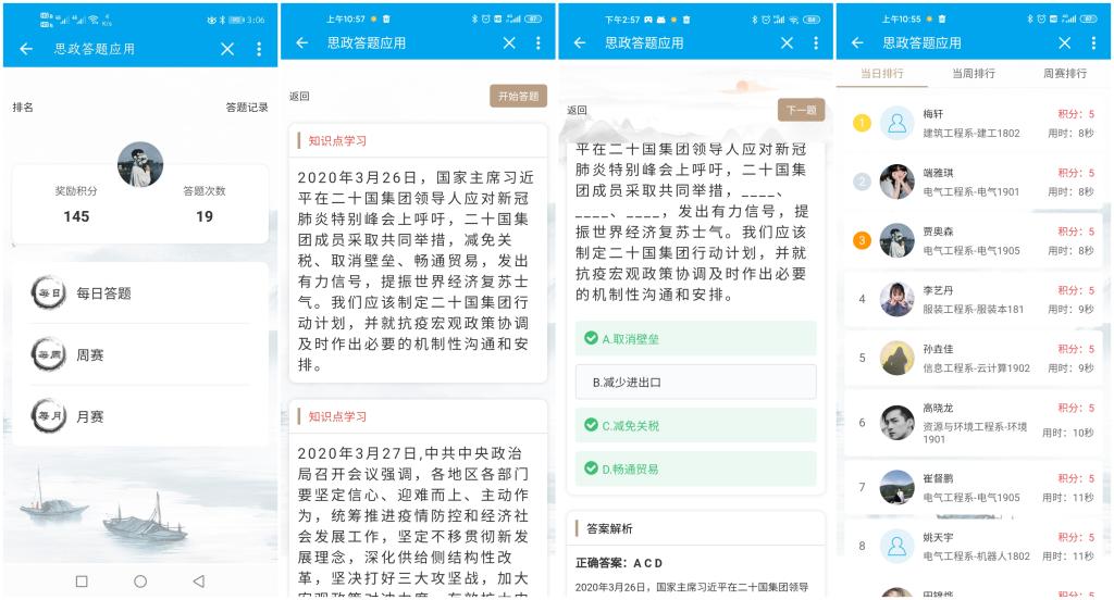 “先锋邢职”借鉴中宣部的“学习强国”学习平台,结合时下五四、全民防疫、征兵教育等热点,采用学生喜闻乐见的线上答题、择优晋级的方式,引导青年学生进一步认同和践行社会主义核心价值观。学生随时随地通过手机参加每日答题并赚取学习积分,每周末排名前15%的学生方可参加线上周赛,周赛成绩优异者可参加开学后举办的线下月赛、年度总决赛,真正达到了寓教于乐。手机端实时更新每日、每周、周赛三大排行榜,“学霸”“学神”一目了然,排名的高低激发同学们的学习热情。学院每周一还会通过钉钉直播抽取50名幸运学生奖励口罩、酒精湿巾、免洗消毒液等防疫用品,并寄送到学生家中,让同学们感觉格外暖心。