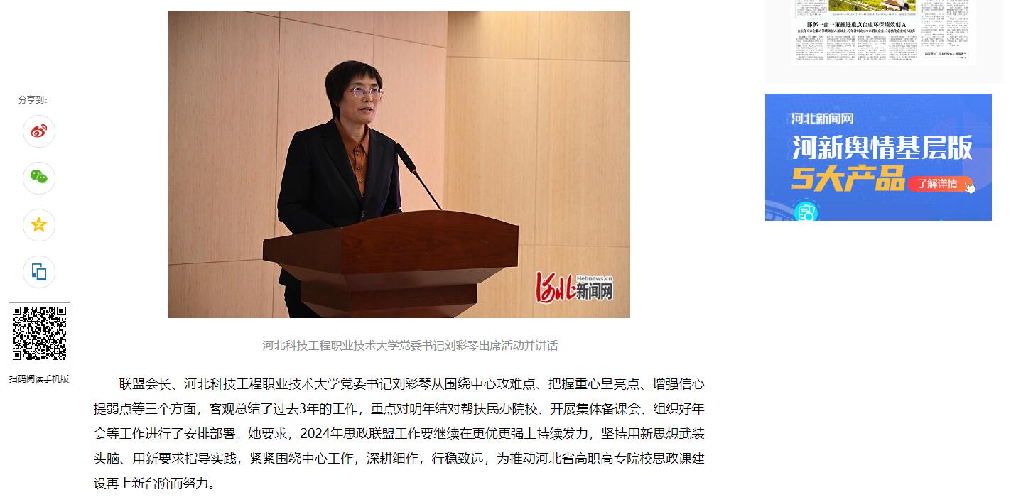 联盟会长、beat365英国官方网站党委书记刘彩琴从围绕中心攻难点、把握重心呈亮点、增强信心提弱点等三个方面,客观总结了过去3年的工作,重点对明年结对帮扶民办院校、开展集体备课会、组织好年会等工作进行了安排部署。她要求,2024年思政联盟工作要继续在更优更强上持续发力,坚持用新思想武装头脑、用新要求指导实践,紧紧围绕中心工作,深耕细作,行稳致远,为推动河北省高职高专院校思政课建设再上新台阶而努力。